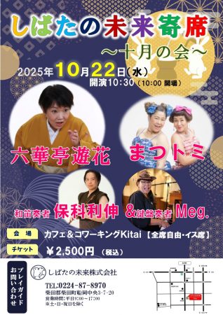 今月開催のしばた未来寄席は、東北弁落語で有名な「六華亭遊花」さんの落語と県内で活躍中の女性お笑いコンビ「まつトミ」の漫才に加えて、伝統的な笛の音色の保科利伸さんと迫力あるピアノ演奏奏者のMegさんの新鮮な演奏をお聞きください。3組の演者さんたちと楽しい時間を過ごす「しばたの未来寄席十月の会」は10月22日(水)に開催です。!