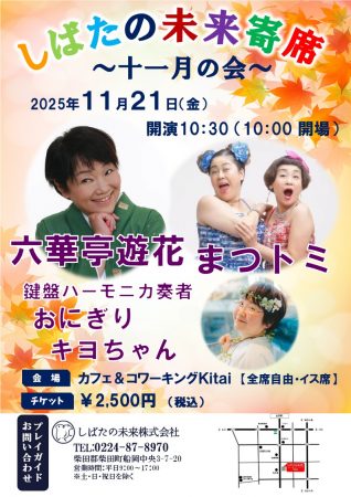 次回のしばた未来寄席は、東北弁落語で有名な「六華亭遊花」さんの落語と県内で活躍中の女性お笑いコンビ「まつトミ」さんの漫才に加えて、ピアニカ奏者「羽賀清子」さんの演奏をお楽しみください。寒さに向かう季節となりましたが、出演者の皆さんの熱のこもった芸に触れてみて下さい。