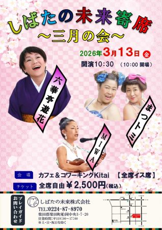 桜開花情報に一喜一憂する3月のしばた未来寄席は、東北弁落語で有名な「六華亭遊花」さんの落語と県内で活躍中の女性お笑いコンビ「まつトミ」さんの漫才に加えて、声量ある歌声の「MIWA」さんの演奏をお楽しみください。3月は、別れと出会いが交差する時期でもあり忙しい時期です。そのような時期のひと時にお笑いと音楽をお届けします。ご来場をお待ちしています。